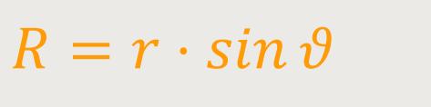 Der Winkel φ ist hierbei jedoch im Bogenmaß gegeben und nicht als Grad, weil man in der Physik im Allgemeinen so vorgeht. Da der Nullpunkt des Koordinatensystems weiter unten auf der Drehachse liegt, bildet der Radiusvektor R mit dem Ortsvektor ein rechtwinkliges Dreieck. Diesen unteren Winkel nennen wir ϑ (theta).