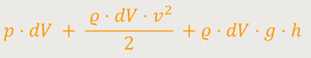 Wenn es insbesondere um die Erhaltung der mechanischen Gesamtenergie geht, kommt es darauf an, wie groß die kinetische Energie eines Fluidelements mit dem konstanten Volumen dV sein wird. Und es stellt sich auch die Frage, wie groß wird die potentielle Energie sein, wenn man die Strömung im Feld der Gravitation auf der Erdoberfläche betrachtet? Und letztlich muss man sich fragen, wenn es unterschiedliche Drücke in diesem System gibt, wie groß wird denn die Arbeitszuführung aufgrund des Druckes sein? In der Praxis kommen für solche Anwendungen Pumpen zum Einsatz, die nichts anderes machen, als Druckdifferenzen zu erzeugen. Also ohne Anfangsdruck keine Druckdifferenz.