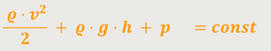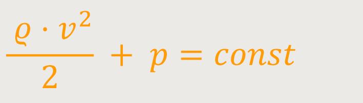 Das bedeutet, wenn bei konstanter Dichte die Geschwindigkeit immer größer wird, umso kleiner muss der Druck werden, damit die Summe der beiden konstant bleibt. Herrschen große Geschwindigkeiten, gibt es demnach kleine Drücke. Das klingt im ersten Moment etwas paradox.