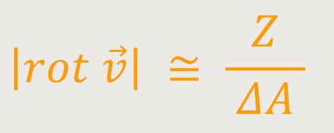 Hier hat man jetzt eine Dimension weniger. Man betrachtet eine Fläche mit ihrem Rand. Und wenn nun längs dieses Randes in dieser Flüssigkeit eine gewisse Zirkulation vorhanden ist, dann muss man diese Zirkulation pro Flächeneinheit bestimmen, also durch die Fläche dividieren, um den Betrag des Rotationsvektors zu erhalten. Die Rotation ist daher in entsprechender Weise eine Wirbeldichte.