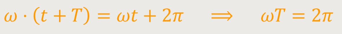 Doch wie lässt sich die Schwingungsdauer feststellen? Die Schwingungsdauer T hat die Eigenschaft, dass wenn man mit der Zeit um eine solche Strecke T fortschreitet, wieder die gleiche Bedingung hat, wie zuvor. Das entspricht einem Voranschreiten um dieses Zeitintervall. Das bedeutet aber: