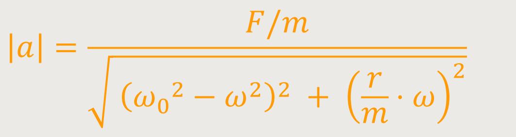 Wenn die Dämpfung nicht zu groß ist, dann wird der zweite Term in der Wurzel klein sein. Und wenn die äußere Anregung in die Nähe der Eigenfrequenz des ungedämpften Oszillators kommt, dann wird der Nenner im ersten Term in der Wurzel sehr klein. Ist allerdings die äußere Anregung gleich dem ω₀, dann fällt dieser erste Term ganz weg.