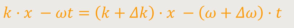 Die zweite Welle auf der rechten Seite (der Gleichung) hat demnach eine leicht unterschiedliche Wellenzahl mit einer leicht unterschiedlichen Kreisfrequenz. Nach dem Wegkürzen bleibt nur mehr stehen: