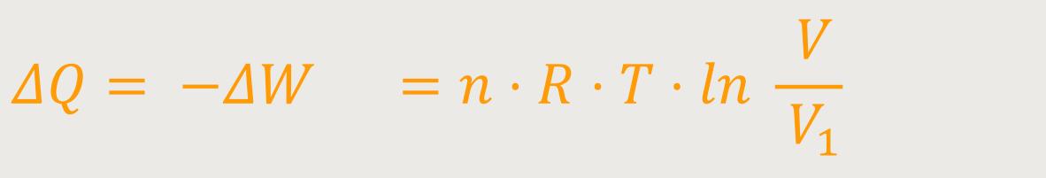 Wenn sich in dem System ein Kolben wegbewegt, dehnt sich das Gas aus. Die Moleküle trommeln zwar nach wie vor an die Kolbenfläche, aber die Energie wird kleiner. Dementsprechend wird auch die Temperatur abnehmen. Um die Temperatur aber konstant zu halten, muss von außen eine Wärmemenge ΔQ zugeführt werden. Es muss betragsmäßig genau so viel Wärmemenge ΔQ zugeführt werden, wie Arbeit −ΔW verrichtet wird.