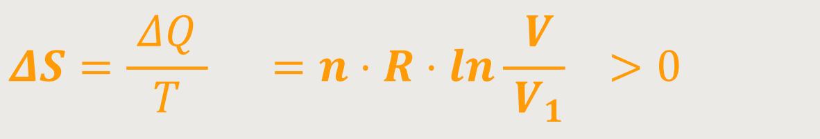 Das heißt, wenn ΔS = 0 ist, gilt das nur für reversible Prozesse in thermisch abgeschlossenen Systemen. Wenn man dagegen einen irreversiblen Prozess hat, kann man die Entropie auf diese Weise nicht ermitteln. Obwohl der gleiche Endzustand durch einen reversiblen Ersatzprozess erreicht werden kann. Man muss halt nur einen Kolben langsam herausschieben, und gleichzeitig die notwendige Wärmemenge ΔQ hinzufügen, um letztlich durch isotherme Expansion den gleichen Endzustand wie beim Beispiel mit dem Ventil zu erreichen. Daher muss die Berechnungsgrundlage für die Entropieänderung ΔS richtig sein, weil hier ein reversibler Prozess die Grundlage bildet.