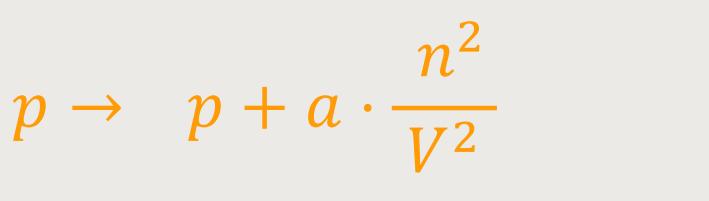 Also, das Volumen, das wirklich für die Bewegung der Moleküle zur Verfügung steht, ist kleiner als das Volumen des Gefäßes. Und der Druck, den die Moleküle im Inneren ausüben, ist größer als der Druck, den man durch irgendeinen Sensor misst.