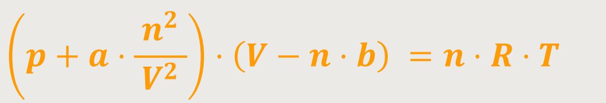 Mit diesen beiden Erweiterungen für p und V lässt sich jetzt die eingangs erwähnte Zustandsgleichung in eine praxisnahe Form bringen. Als Basis dient weiterhin die vereinfachte Zustandsgleichung für ideale Gase, aber jetzt ergänzen wir entsprechend, indem wir einsetzen: