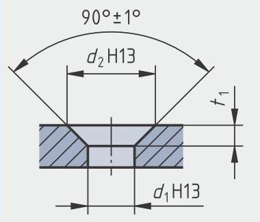 | Gewinde- größe d | Durch- gangs- loch d1 mittel | Kegel- senkung d2 | Tiefe der Senkung t |