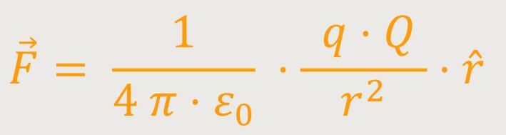 Das Coulomb-Gesetz besagt, dass die Kraft zwischen zwei Punktladungen gegeben ist durch einen Vorfaktor und den beiden entsprechenden Ladungen: