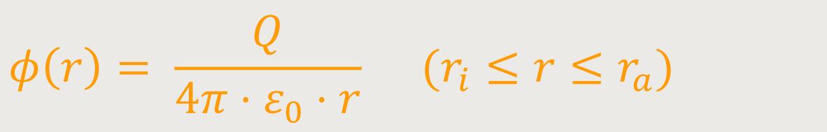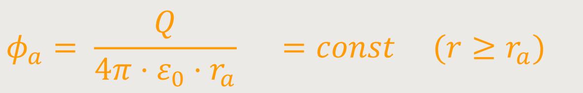 Beide Kugeln sind leitend und geladen, wobei die innere eine Ladung +Q trägt, und die äußere eine Ladung −Q. Zusätzlich gibt es im Innenraum ein Potential ϕi und im Außenraum ϕa. Die Gesamtladung ist gleich Null. Der Außenraum ist wegen des Gauß'schen-Gesetzes feldfrei. Der Innenraum der inneren Kugel ist ebenfalls feldfrei. Wenn ein Bereich feldfrei ist, dann wird das Potential dort konstant sein.