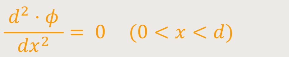 Der Innenraum (Zwischenraum) ist auch hier ladungsfrei. Die Ladungen sitzen nur auf den Platten. Jetzt interessiert uns besonders das Potential ϕ im Innenraum. Deshalb verwendet man hier die Laplace-Gleichung Δϕ = 0. Wenn man nur ein eindimensionales Problem betrachtet, bzw. die anderen beiden Komponenten Null sind, reduziert sich die Laplace-Gleichung auf: