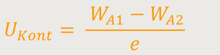 Wenn man also zwei Metalle miteinander in Kontakt bringt, wie zum Beispiel Kupfer und Zink, werden Elektronen herüber diffundieren. Auf der Kupferseite wird es zunehmend negativ, weil negative Elektronen vom Zink herüberwandern. Und auf der Zinkseite wird es zunehmend positiv, so dass sich beide Metalle letzten Endes angleichen. Diese Kontaktspannung, die man dadurch erhält, lässt sich wie folgt darstellen: