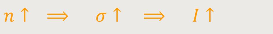 Nun ist man daran interessiert, dass der Elektrolyt möglichst gut leitet. Also gibt man möglichst viele Ladungsträger in die Lösung, bis diese gesättigt ist. Und wenn die „Ladungsträgerkonzentration” n steigt, wird auch die Leitfähigkeit σ zunehmen. Und damit wird letztlich auch die Stromstärke zunehmen.