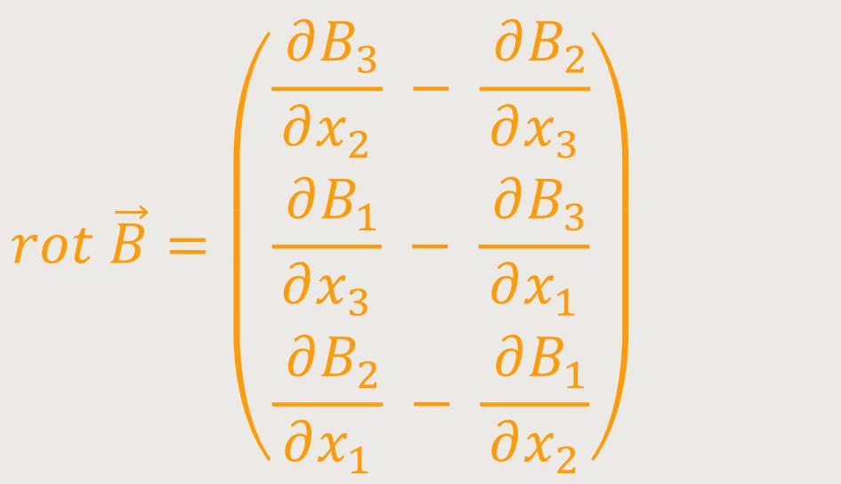 Eine Rotation ist nichts Geheimnisvolles, es ist lediglich ein Vektor. Wenn man ein Vektorfeld betrachtet, zum Beispiel das Vektorfeld der magnetischen Flussdichte, dann wird es durch drei Komponenten B₁, B₂, B₃ beschrieben, die jeweils eine Ortsfunktion sind. Und nun erstellt man entsprechend dieser Vorschrift die partiellen Ableitungen, und erhält damit den Vektor mit den obigen drei Komponenten. Als Ergebnis erhält man den Vektor für die Rotation.