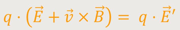 Daraus kann man erkennen, dass die Kraft zwar gleich ist, aber jedes der beiden Systeme hat demnach ein separates elek­trisches Feld. Im System S' tritt zusätzlich zu ein elek­trischer Feld­anteil ( × ) auf, der aus dem Magnetfeld erwächst.