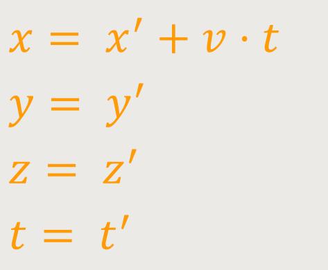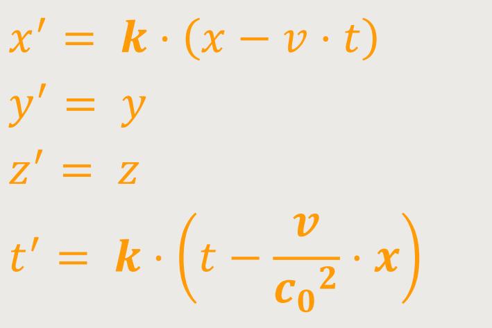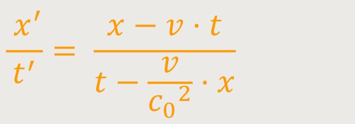 Diese Koordinaten-Transformation bildet die Grundlage für die weitere Betrachtung. Dabei gilt zu berücksichtigen, dass die Zeit bei den relativistischen Überlegungen ebenfalls eine wesentliche Rolle spielt, und diesem Umstand wird ebenfalls Rechnung getragen.