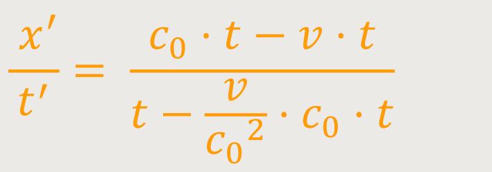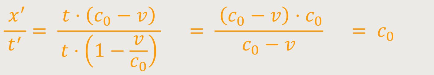 Und damit haben wir das Prinzip von der Konstanz der Lichtgeschwindigkeit bestätigt. Das ist der überzeugende Vorteil der Lorentz-Transformation gegenüber der Galilei-Transformation.