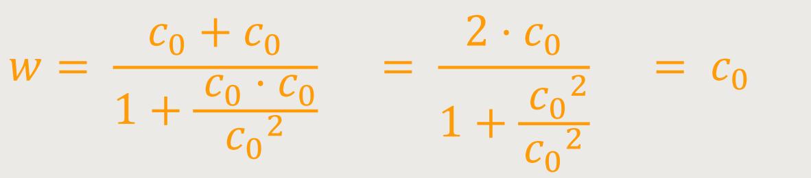 Hier bestätigt sich, dass der Schaffner dem Licht nicht vorauseilen kann. Schneller als das Licht bewegt sich nichts, und damit entspricht c₀ nach wie vor der Grenzgeschwindigkeit.