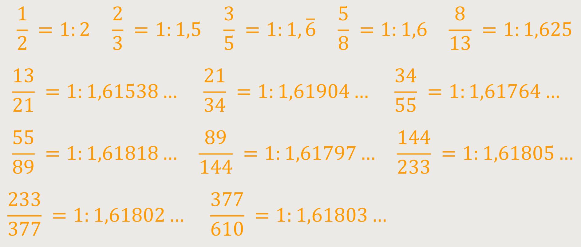 Je mehr Spiralzüge das betrachtete Objekt aufweist, umso exakter wird das Verhältnis des Goldenen Schnitts. Und das heißt wiederum, je exakter das Verhältnis zweier aufeinander folgender Fibonacci-Zahlen, desto mehr nähert sich das Verhältnis der Naturkonstanten Φ (Phi) an.