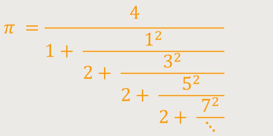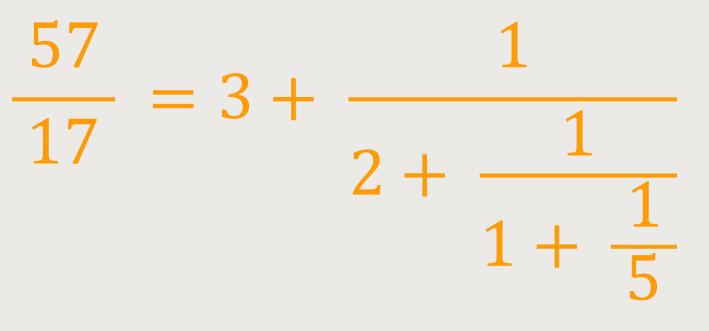 Es gibt noch eine weitere Formel, die selbst unter Mathematikern nicht so verbreitet sein soll. Jeder mathematische Bruch lässt sich bekanntlich als sogenannter Kettenbruch darstellen. Beim Kettenbruch wird das Verhältnis simplifiziert, indem man den ursprünglichen Bruch in einfachere Brüche aufgliedert. Zähler jedes einzelnen Bruches ist die Zahl Eins. Zum Beispiel lässt sich ein rationales Verhältnis wie folgt darstellen: