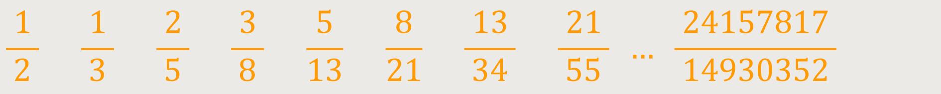 Es handelt sich bei der Zahlenreihe sowohl im Nenner als auch im Zähler jeweils um Zahlen, die wir als die Fibonacci-Folge kennengelernt haben, nur lediglich um zwei Stellen verschoben.