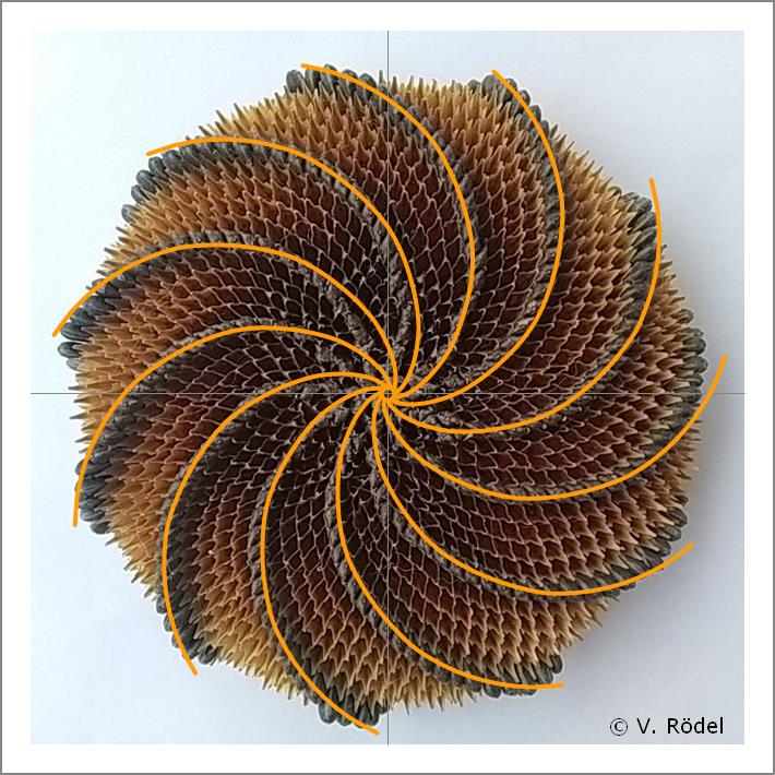 Dies kann man am Blütenkorb der Sonnenblume bzw. der späteren Anordnung der Samen sehr schön erkennen. Die Goldene Spirale bildet in den meisten Fällen nur die Grundlage für die Anzahl rechtsläufigen und der linksläufigen Spiralkurven.