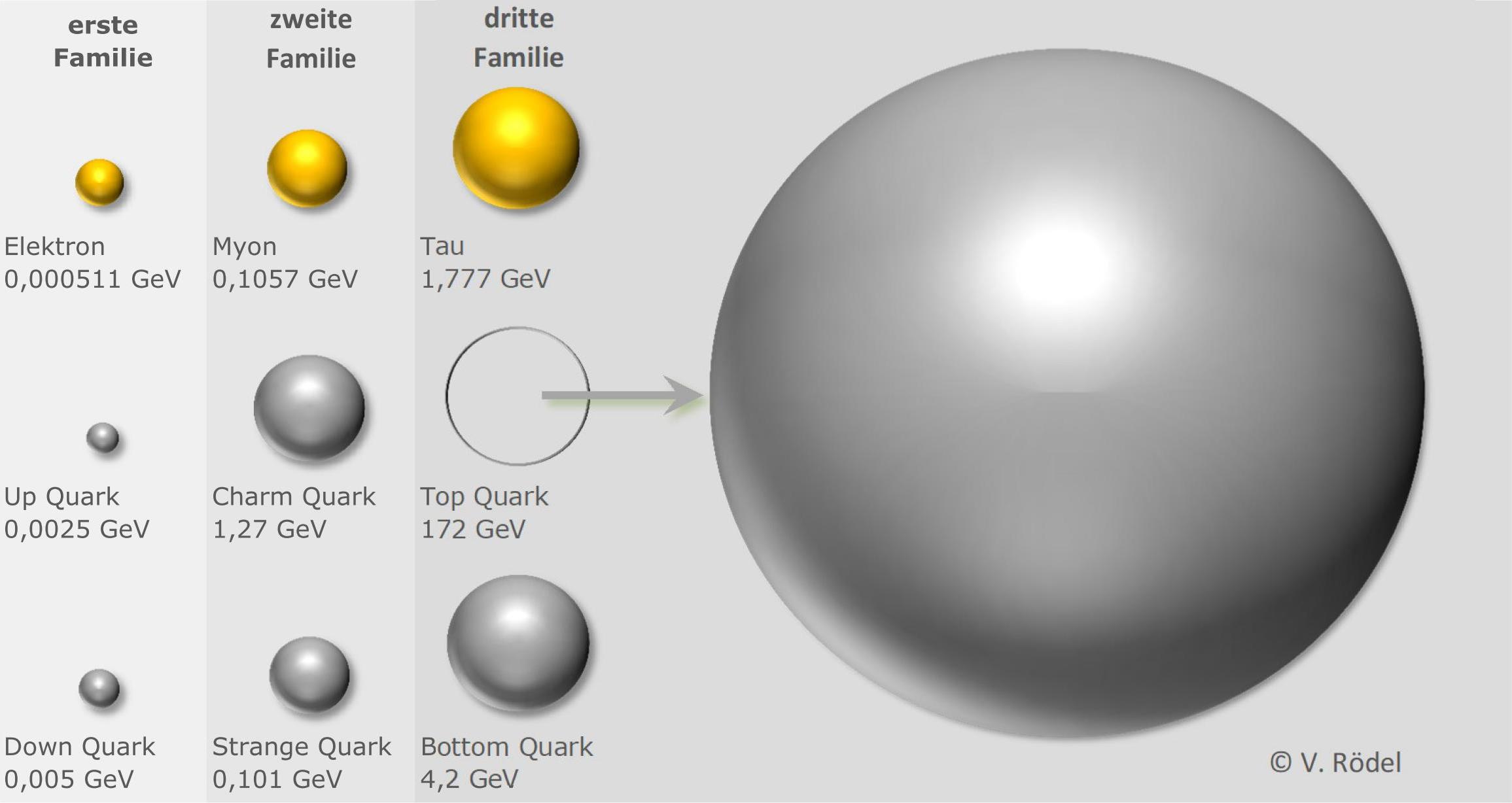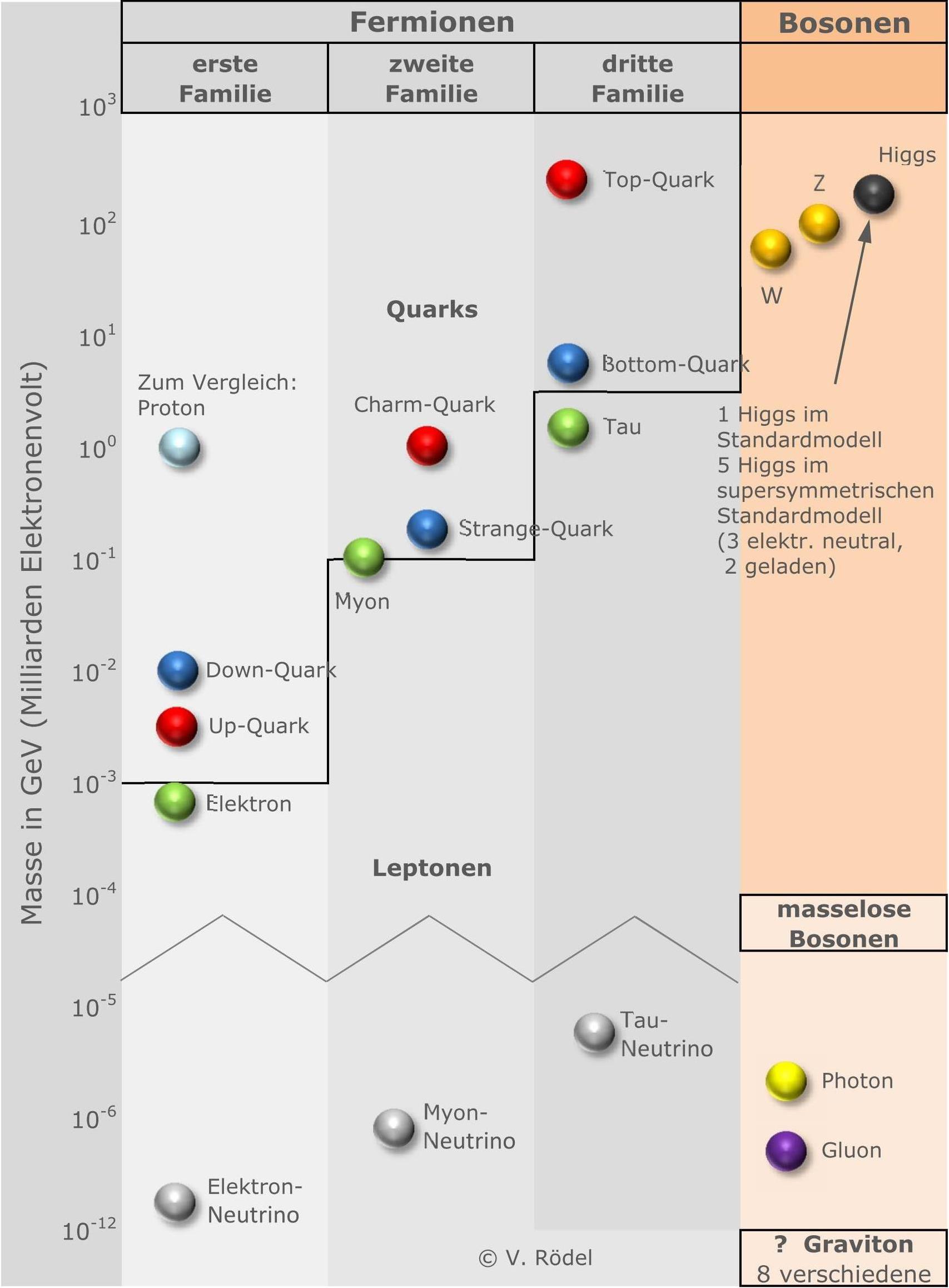 Die Fermionen wiederum teilen sich in drei „Familien” auf, deren Unterschied darin besteht, dass die jeweiligen Massen der Quarkteilchen in der nachfolgenden Familie wesentlich größer sind, als in der vorherigen. Wenn man hierbei von einer Masse spricht, dann ist damit Elektronenvolt (eV) gemeint. Die Ladung kann je nach Familie bis zu einigen Milliarden Elektronenvolt (GeV) betragen.