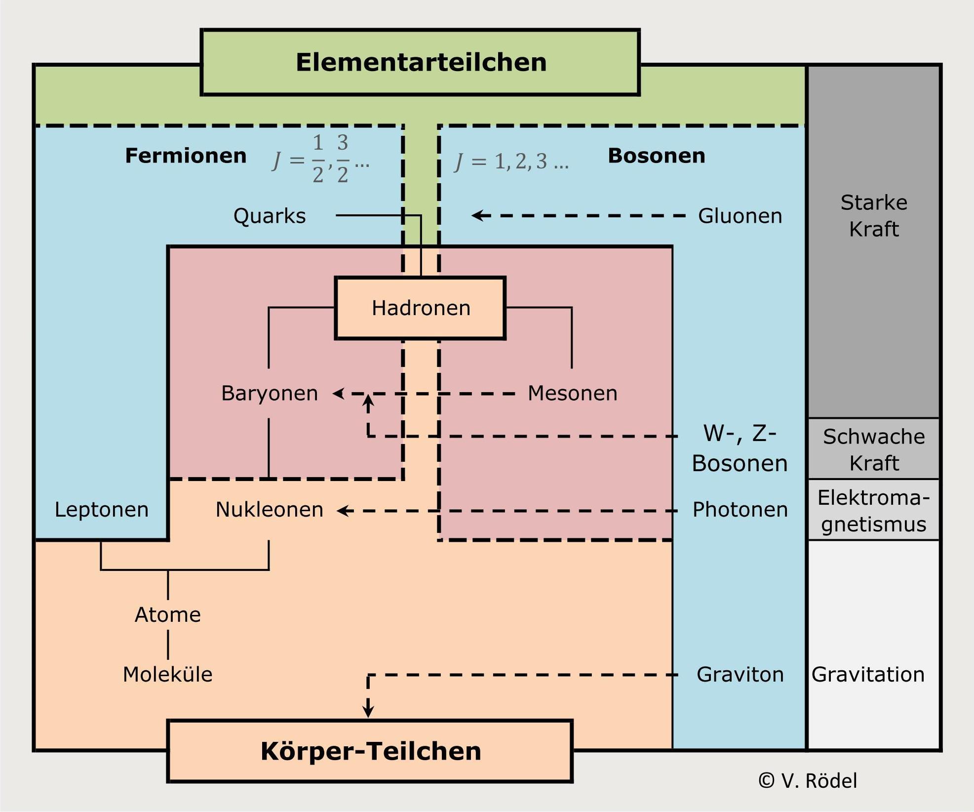 Man unterteilt die Elementarteilchen grob in zwei „Gruppen”, in Fermionen und in Bosonen. Die Teilchen, welche keine vermittelnde Funktion übernehmen, also die Elektronen und die Quarks gehören zu den Fermionen und sind für die Masse, sprich die stoffliche Welt verantwortlich. Die Bosonen dagegen vermitteln die Kräfte zwischen den Fermionen.