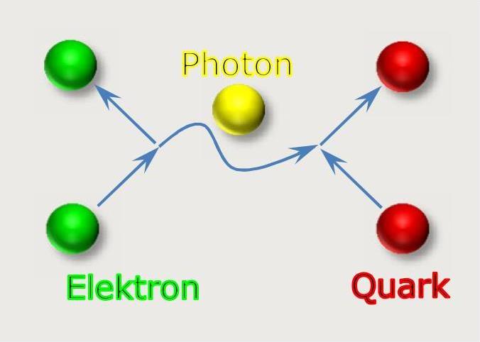 Doch wie wechselwirken die Fermionen mit den entsprechenden Bosonen? Voraussetzung ist zunächst einmal eine elektrostatische Wechselwirkung im Atom. Betrachten wir z. B. ein Wasserstoff-Atom, dessen Kern aus einem Proton(+) mit seinen „3” Quarks besteht. In der Hülle kreist das Elektron(−). Ein solches Elektron wechselwirkt mit einem Quark. Das geschieht mittels eines virtuellen Photons, des sogenannten Feldteilchens. Da derartige virtuelle Teilchen zu diesem Zeitpunkt noch nicht real existieren, haben sie auch keine Masse. Doch das Proton kann durch Anregung ein elektrisches Feld E erzeugen. Erst wenn dieses Feld zum Schwingen angeregt wird, wird aus dem virtuellen Photon ein reales. Nun erhält dieses Photon auch Masse durch die Energie der Schwingung und kann anschließend mit anderen Teilchen wechselwirken.