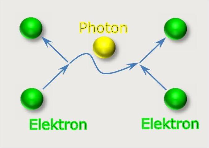 Die Wechselwirkung zwischen zwei Elektronen sieht ähnlich aus. Wenn sie aufeinander treffen, stoßen sie sich zunächst aufgrund ihrer gleichen Ladung ab. Der Austausch der Elektrostatischen Wechselwirkung erfolgt auch hier wieder über das virtuelle Photon. Alle Teilchen, die eine elektrische Ladung besitzen, wechselwirken mittels eines Photons.