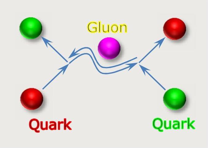 Die Quarks sind, wie oben bereits erwähnt, die Teilchen, die im Kern miteinander wechselwirken, insbesondere mit den Gluonen. Letztere sind nämlich die Vermittler der Starken Wechselwirkung. Ihre Reichweite beträgt allerdings nur ein Femtometer (fm) (10-15m), weshalb die Gluonen eine hohe Masse haben. Und das ist auch ein wesentlicher Grund, warum die Gluonen untereinander wechselwirken.