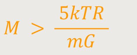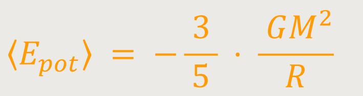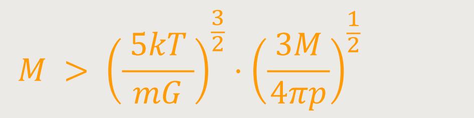 In obiger Beziehung scheint es so, dass die potentielle Energie mit dem Radius der Wolke abnimmt. Aber es ist vielmehr so, dass die potentielle Energie mit der Gesamtmasse quadratisch zunimmt und lediglich durch den Radius dividiert wird. Mit anderen Worten, die Wolke kollabiert, wenn dieses Gleichgewicht nicht mehr vorhanden ist, weil die potentielle Energie, sprich die gravitative Kraft größer wird als die kinetische Energie.