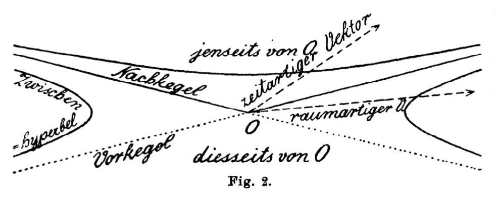 Den ersten, uns zugewandten Bereich, hatte Minkowski als „Vorkegel” bezeichnet, der aus allen Weltpunkten bestehen soll, die Licht „in Richtung O senden”. Der zweite, von uns weggewandte Bereich, bezeichnete er als „Nachkegel”, der seinerseits aus allen Weltpunkten besteht, die Licht „von O ausgehend” empfangen. Die vom Vorkegel eingegrenzte Fläche bezeichnete Minkowski als „diesseits von O” und die Fläche des Nachkegels als „jenseits von O”. Jenseits von O entspräche dann der weiter oben betrachteten hyperboloidischen Schale: