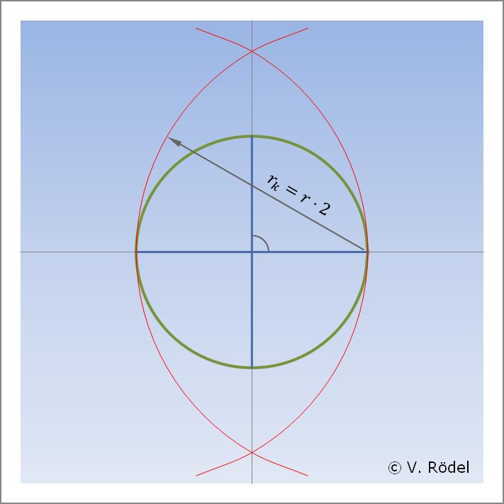 Mithilfe des Kosinussatzes können wir uns an den Grenzwert herantasten, und erhalten schließlich einen Wert für den kleinen Radius r3 von 30,2572 mm. Das wäre der „exakte” Radius des kleinen Kreises bei einem Ausgangskreis mit einem vorgegebenen Radius r1 von 100 mm.