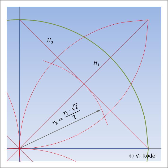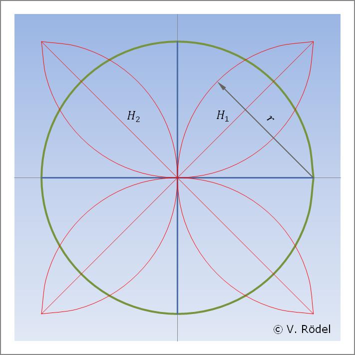 Nun schlagen wir 4 weitere Halbkreise mit dem Radius r, wobei die Mittelpunkte den Schnittpunkten (Endpunkten) der beiden lotrechten Linien am Kreisumfang entsprechen. Anschließend zeichnen wir 2 diagonale Hilfslinien H1 und H2 ein, dessen Enden mit den Schnittpunkten der Halbkreise zusammentreffen. Es entsteht eine Art „Blattmuster”.