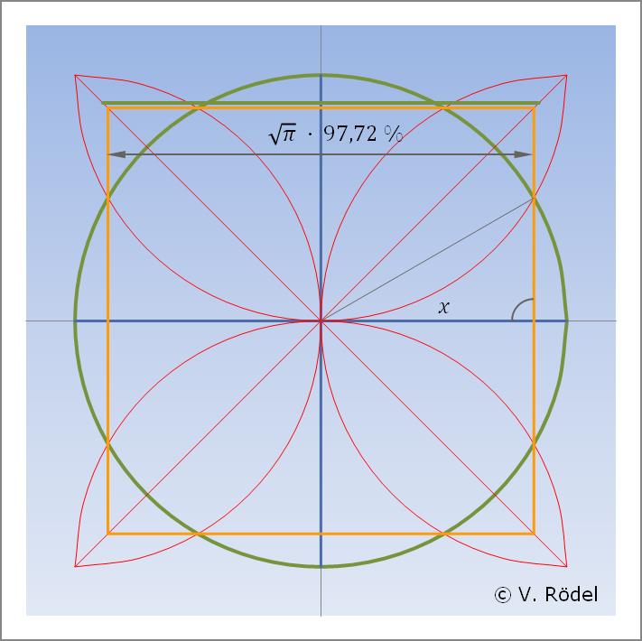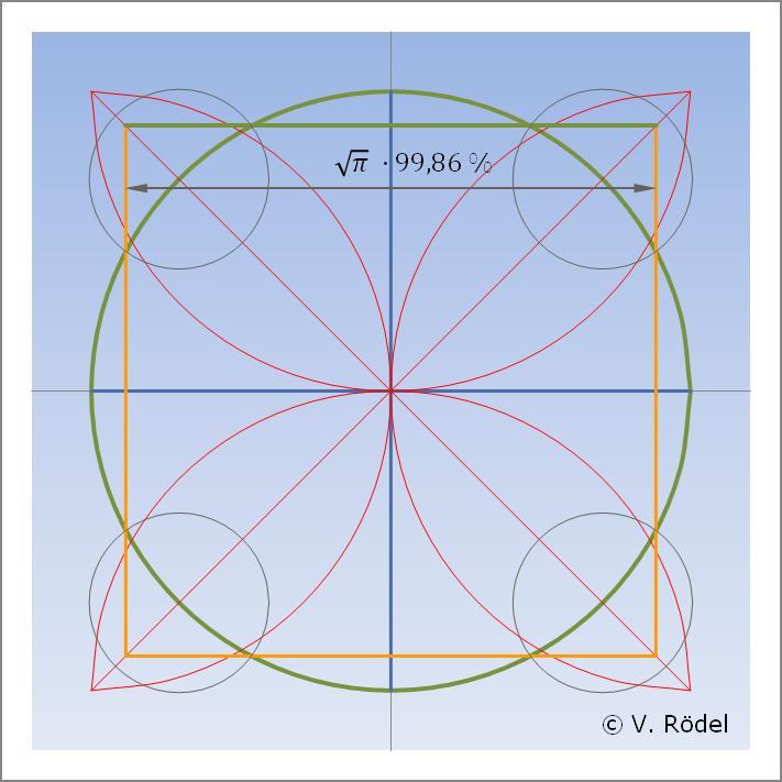 Aus Sicht des Näherungsverfahrens allerdings ist es möglich, bis auf 4/100 genau einen nahezu gleichen Flächeninhalt nur mithilfe eines Zirkels und eines Lineals in lediglich 23 Schritten zu konstruieren, wobei der obige dritte Schritt übersprungen wird.