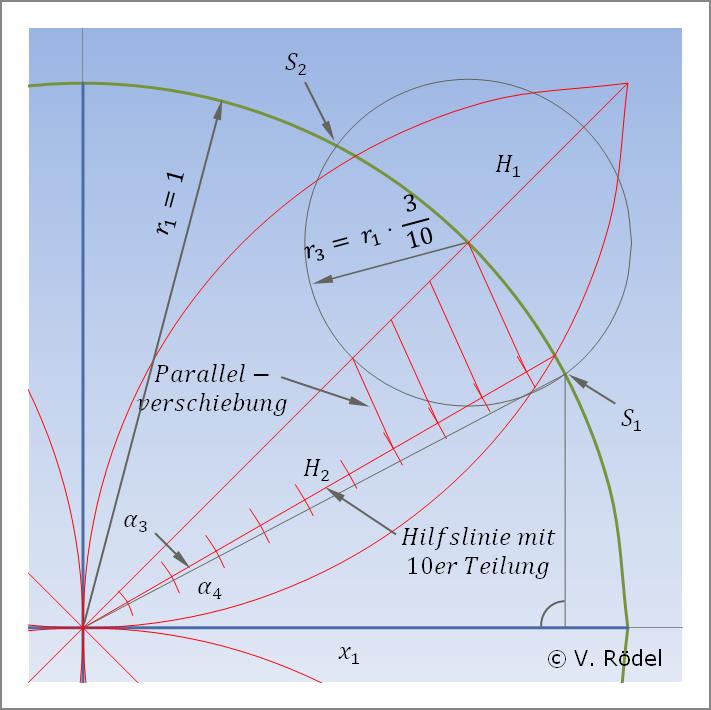 Zur besseren Betrachtung vergrößern wir zunächst den oberen rechten Bereich und zeichnen eine Hilfslinie H2 ein, die geometrisch bedingt genau unter 30° angeordnet ist. Auf dieser Hilfslinie tragen wir mit einem Zirkel 10 kleine, gleichgroße Teilabschnitte auf. Anschließend werden mithilfe der Parallellinien-Konstruktion diese Abschnitte auf die diagonale Hilfslinie H1 übertragen. Genau 7/10 vom Kreisradius r1, schlagen wir einen kleinen Kreis mit dem Radius r3 = 3/10. Dadurch ergeben sich die Schnittpunkte S1 und S2 auf dem großen Kreisumfang.