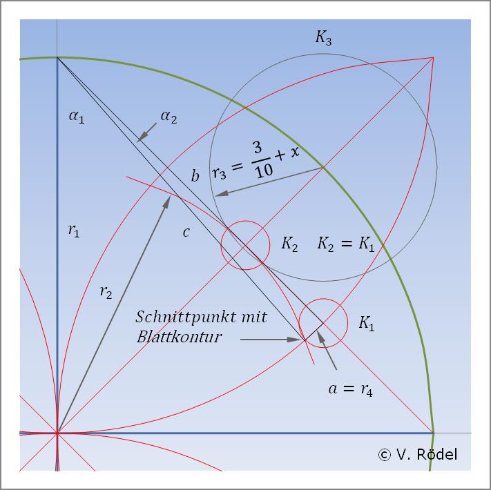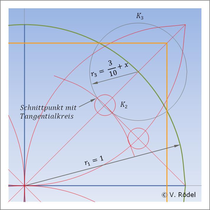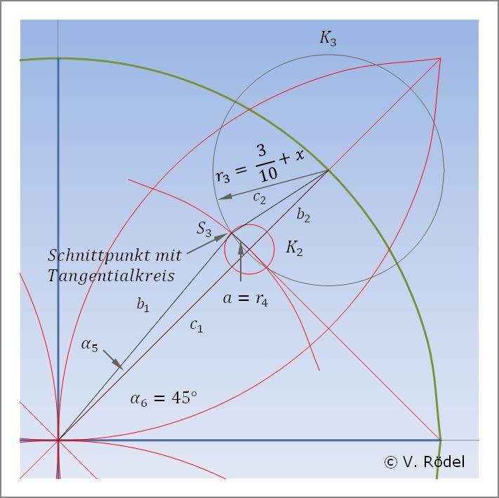 Bei genauem Hinschauen kann man erkennen, dass dieser zweite „kleinste” Kreis K2 mit dem Tangentialkreis r2 nochmals zwei Schnittpunkte bildet. Diese Punkte ergeben dann den Radius des bereits unter Schritt drei beschriebenen mittelgroßen Kreises r3 mit dem Wert 3/10 + x. Im vorliegenden Fall sind das 30 mm + x.