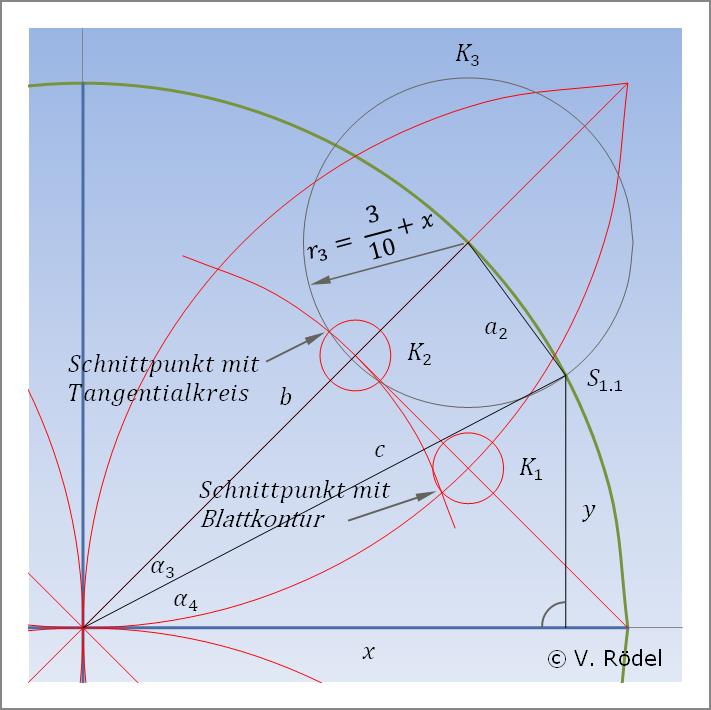 Sowohl die neue Hilfslinie H3 als auch der Tangentialkreis r2 schneiden die „Blattkontur” an jeweils 2 Punkten. Einer dieser Schnittpunkte dient jetzt als Mittelpunkt für einen weiteren kleinen Kreis K1. Der Radius dieses Kreises soll mit dem Punkt zusammentreffen, wo sich der Schnittpunkt des Tangentialkreises r2 mit der Blattkontur befindet. Den so ermittelten Radius übertragen wir auf den eigentlichen Tangentialpunkt, indem wir dort einen zweiten Kreis K2 übertragen.