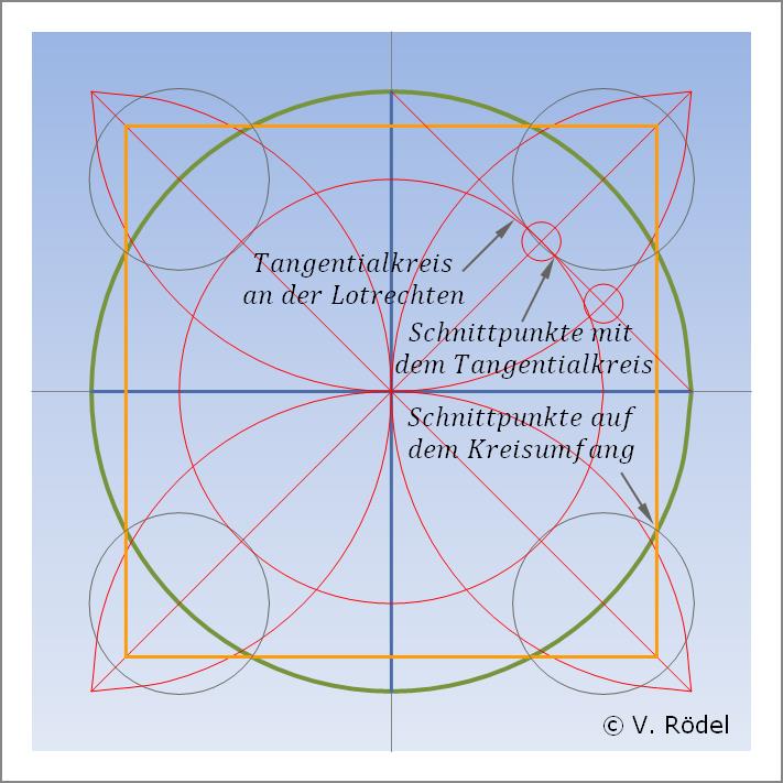 Ziel ist es also, nur mithilfe von Zirkel und Lineal sowie mit möglichst wenig Schritten ein Quadrat zu konstruieren, dass den gleichen Flächeninhalt wie der vorgegebene Kreis hat.